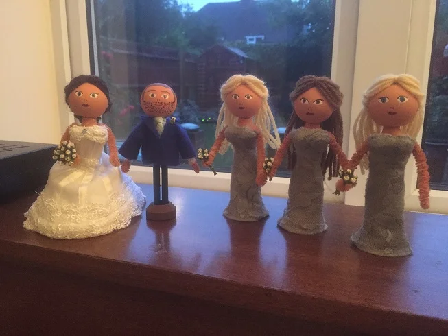 . peg dolls made for the cast of 'lend me a tenor' and as wedding gifts/cake toppers .